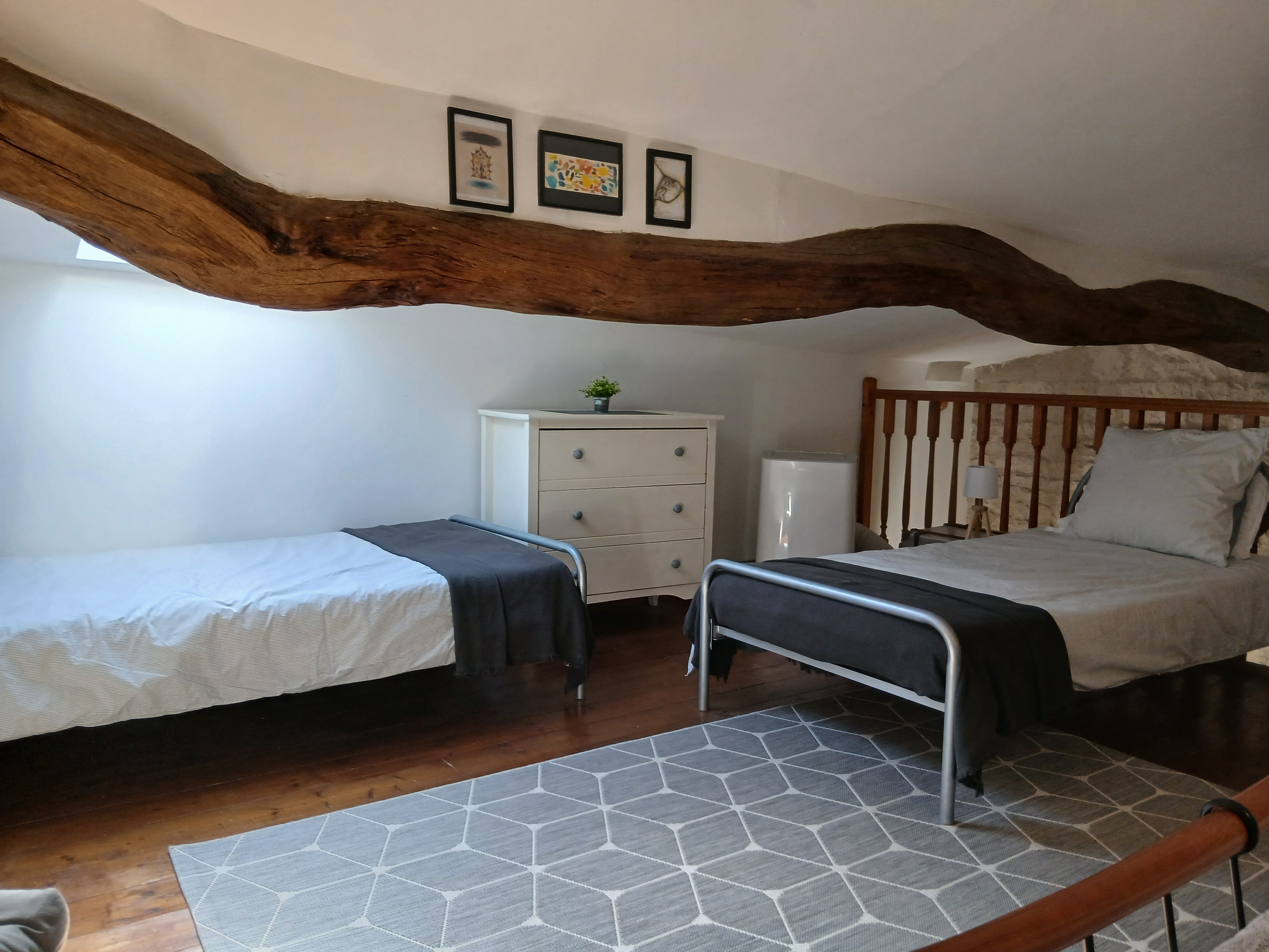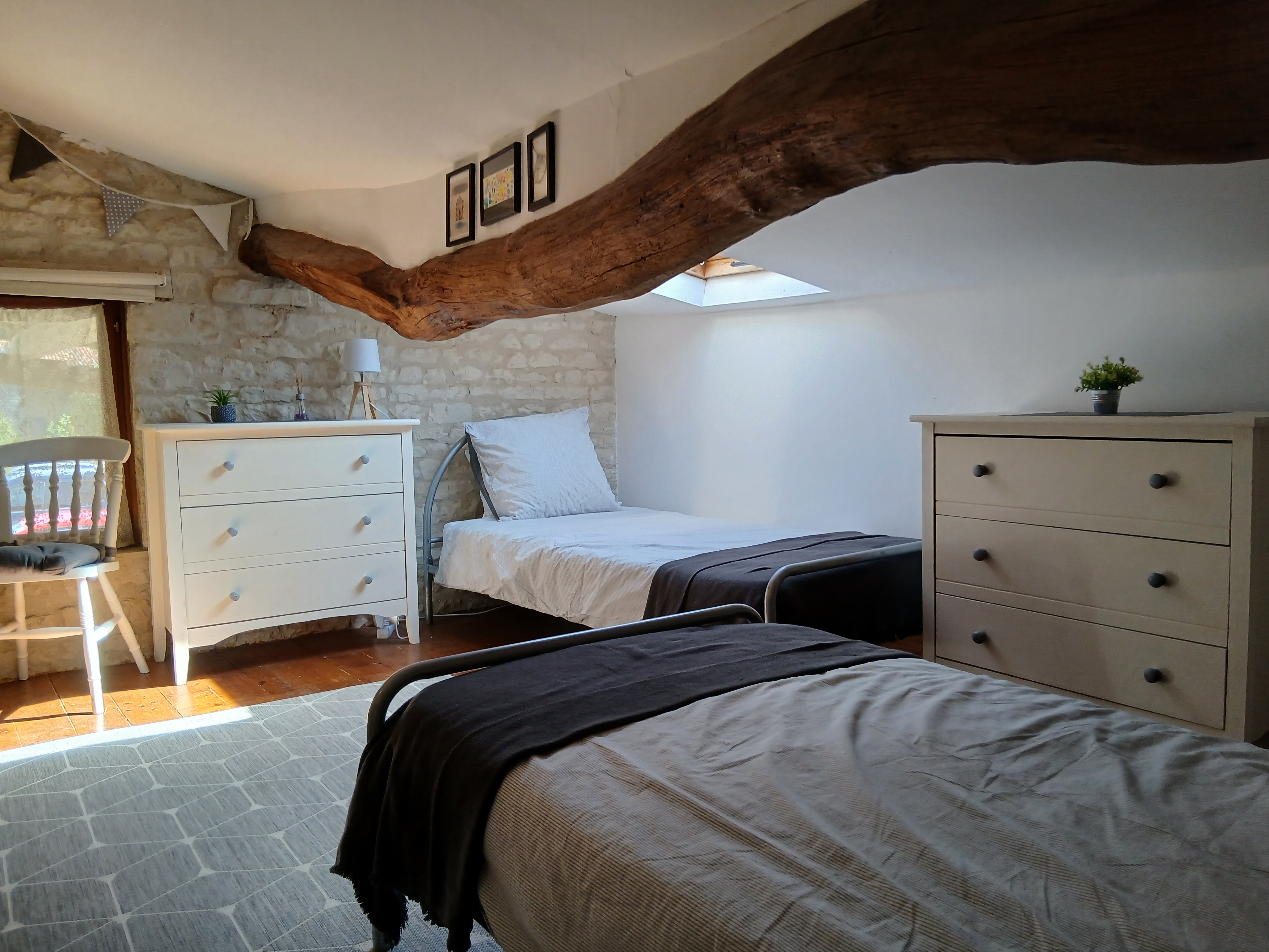 You enter the Barn from the large, covered private terrace. The front door opens into the kitchen/living area. The kitchen is fully equipped and contains all the equipment and utensils you should need during your stay including oven, hob, microwave, fridge, toaster, kettle and filter coffee machine. The lounge area has a double sofa bed, two arm chairs, coffee table and TV, with a dining table and 4 dining chairs. Upstairs is a large bedroom with stone walls and exposed beams. There is with a super king size bed and 2 single beds. The single beds are in the eaves, with restricted headroom, so are more ideally suited to young children. With the sofa bed in the living room, there are a number of possibilities for sleeping arrangements should 2 adults and 2 children wish to stay here. There is room for a cot if required. The bedroom has an air-conditioning unit, so stays cool throughout the summer. There is hanging space and two sets of drawers, bedside tables and bedside lights. The shower room leads off from the bedroom.